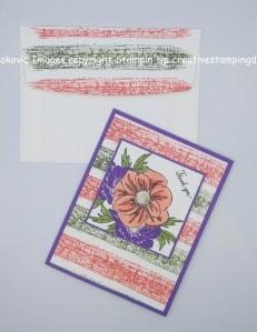 To finish my card I stamped the floral image from the Art Gallery stamp set in Pool Party Ink on the envelope front. I stamped once full strength and a couple more times stamped off once. I adhered a panel of the Fine Art Floral DSP to the envelope flap.