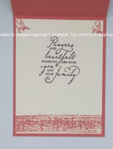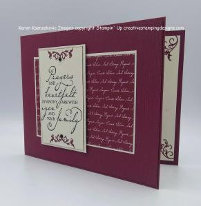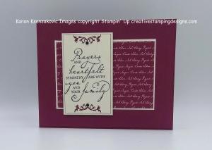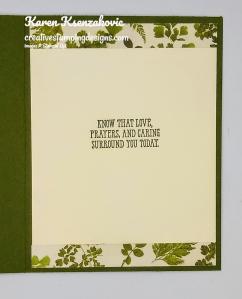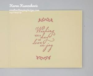 On the inside I stamped the sentiment from the Stampin’ Up! Woven Heirlooms Cling Stamp Set in Pretty Peacock Ink in the center of a Whisper White panel. I stamped the large floral image from the Art Gallery stamp set in Pool Party Ink, stamping off once, over the sentiment. I adhered the Whisper White panel to a Pool Party mat using Stampin’ Seal and then to the inside of the Pretty Peacock card base using Multipurpose Liquid Glue.