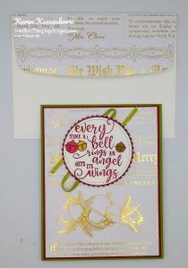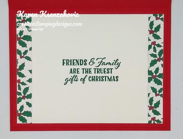 On a strip of Mossy Meadow cardstock I stamped the sentiment from In The Pines stamp set in Versamark Ink. I immediately sprinkled it with my White Stampin’ Emboss Powder and set it using my Heat Tool. I adhered the sentiment strip to the card front using Stampin’ Dimensionals. I added a few Real Red Wonderful Gems to the artwork panel. I adhered the artwork to the card front using Stampin’ Dimensionals.