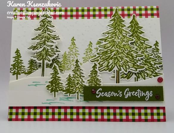 I started by adhering a panel of Heartwarming Hugs Designer Series Paper to a Real Red card base using Multipurpose Liquid Glue. On a panel of Whisper White cardstock I stamped 2 of the largest tree and the group of 4 tree outlines from the Stampin’ Up! In The Pines Photopolymer Stamp Set in Old Olive Ink. I stamped the fill images for the same trees in Old Olive Ink, stamping off once. I stamped the tall tree outline from In The Pines stamp set in Mossy Meadow Ink on the Whisper White panel and the fill image for the same tree in Mossy Meadow Ink, stamped off once. I cut all the trees out using my Pine Woods Dies.