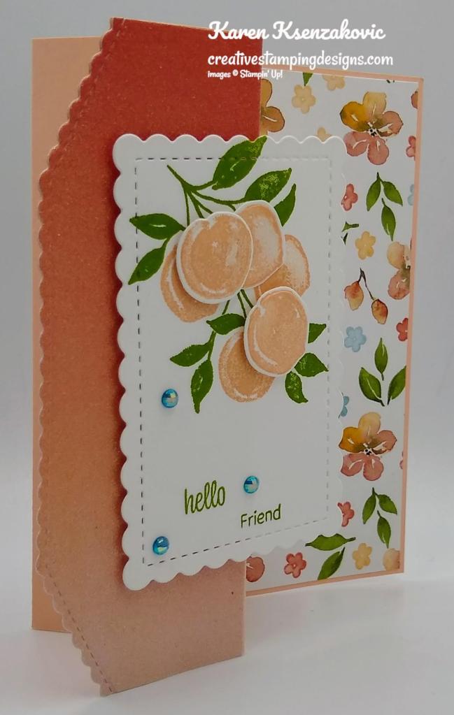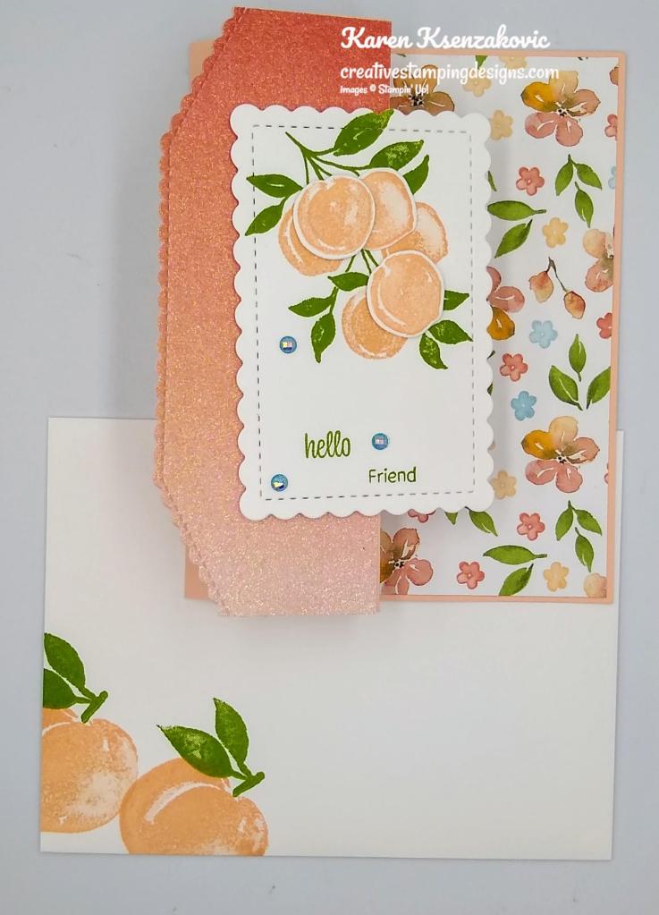 - You’re A Peach Designer Series Paper 2 1/2″ X 4 1/4″ (card front panel), 1/2″ X 4″ (inner liner strip), 2 1/4″ X 6″ (envelope flap)