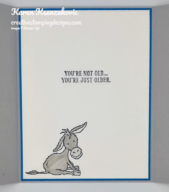 On the inside I stamped the sentiment from the Stampin’ Up! Oval Occasions Cling Stamp Set in Tuxedo Black Ink in the center of a Basic White panel. I stamped the zebra image from the Zany Zebras stamp set on the bottom of the panel in Tuxedo Black Ink and colored the inside of the ears, nose and mouth with my Petal Pink Stampin’ Blends Markers. I adhered the Basic White panel to a Petal Pink mat using Stampin’ Seal and then to the inside of the Cinnamon Cider card base using Stampin’ Seal.